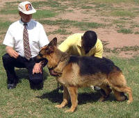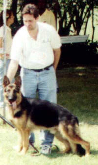A two-year-old dog bred by Dave Hall of the UK was first in Novice Class: Gayville Italo at Altel is a son of German-born Hinnerk Kiemoor and Aika Fuerstenburg. It was not explained why he was still in Novice. Italo was the sire of the 1st-place Puppy Dog, Zeeke of Altel, owned by the partnership of Azan, King, & Campbell, oddly and inadvisably known here as “AKCâ€. The Gayville connection was evident also in the Junior Class, as the imported winner Zentrum Fimmo at Jadsville was the product of Blerio Reflection and Gayville Zandra. Owned by Jalil Dabdoub, this excellent young dog is of no more than medium size, has much black color, and excellent anatomy and gait. He has firm ligaments, and as you should know, “dry and firm†is an important thing to look for in the working dog, and von Stephanitz said that the GSD is nothing if it is not a working dog. I considered him for Reserve to the Best Male in the challenge class. In the next male class, called “Limit†because dogs are limited to one Challenge Certificate there (another one and they have to move into another class), the winner was the eventual Best Male (including the Challenge Certificate) and Reserve BIS, Jutone’s Hijack at Altel, owned by Alfred Campbell and imported from Tony Trant of southern England. This was a son of Held v. Susannenhain (Mark Haus Beck son). I say “was†because tragically he died that very night. Bloat was suspected. The Reserve Challenge Certificate, also bred and exported by Trant, was Jutone’s Vito at Kendrew.